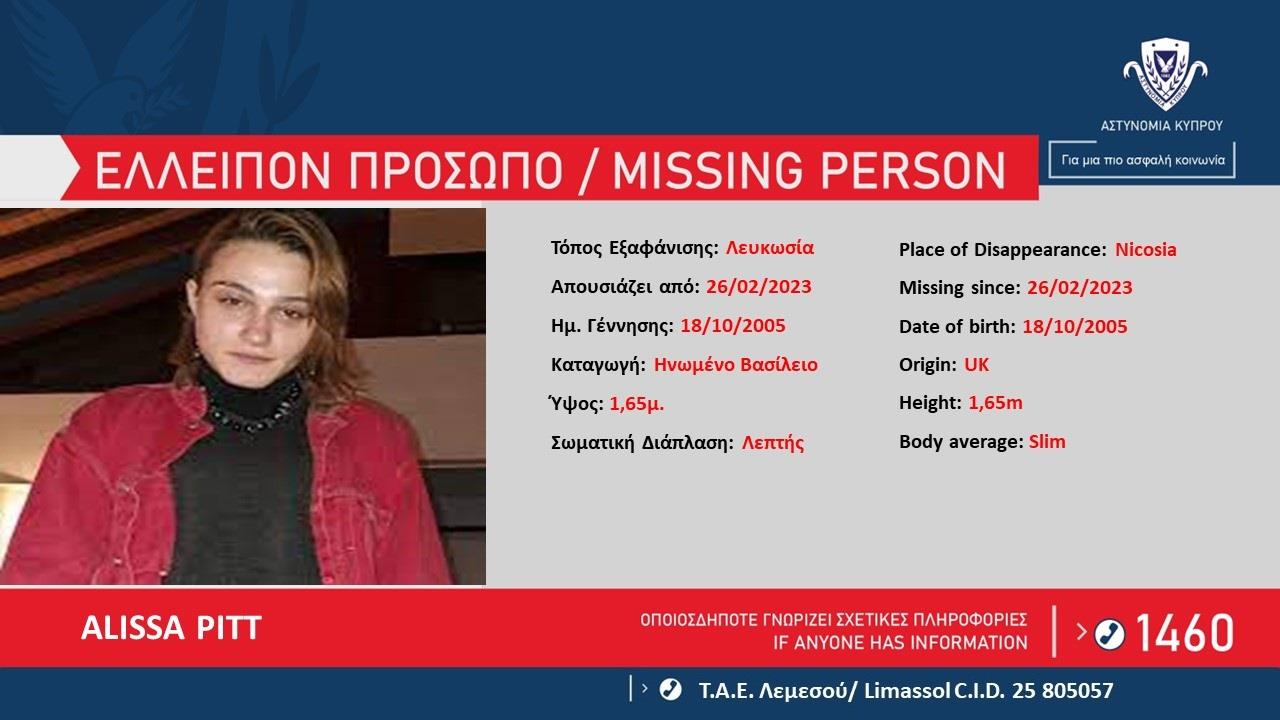 Η Αστυνομία ζητά εκ νέου πληροφορίες που μπορούν να βοηθήσουν στον εντοπισμό της ALISSA PITT, 17 ετών, η οποία απουσιάζει από τις 26/2/2023 από τον χώρο διαμονής της στη Λευκωσία.