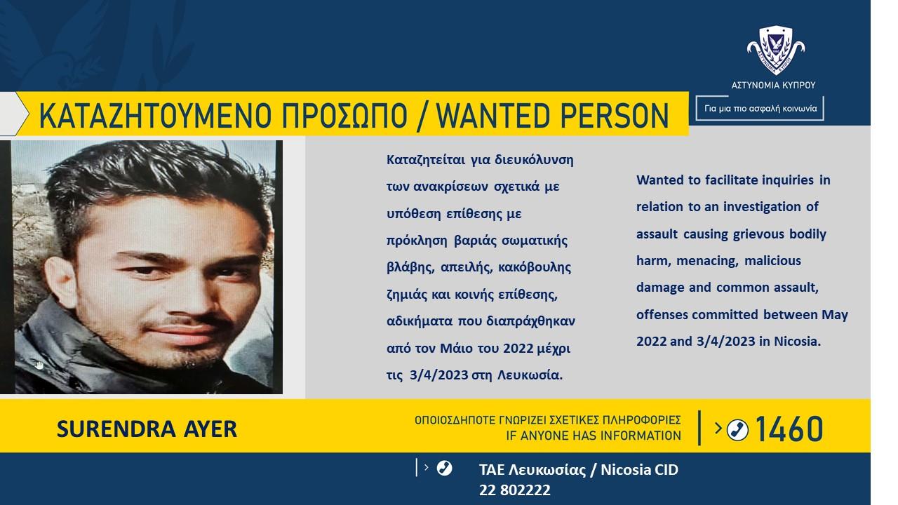 Η Αστυνομία ζητεί πληροφορίες για εντοπισμό του SURENDRA AYER 24 ετών, από το Νεπάλ, φωτογραφία του οποίου δημοσιεύεται, σχετικά με διερευνώμενη υπόθεση επίθεσης με πρόκληση βαριάς σωματικής βλάβης, απειλών, κακόβουλης ζημιάς και κοινής επίθεσης, αδικήματα που διαπράχθηκαν μεταξύ Μαΐου 2022 και 3/4/2023 στη Λευκωσία.