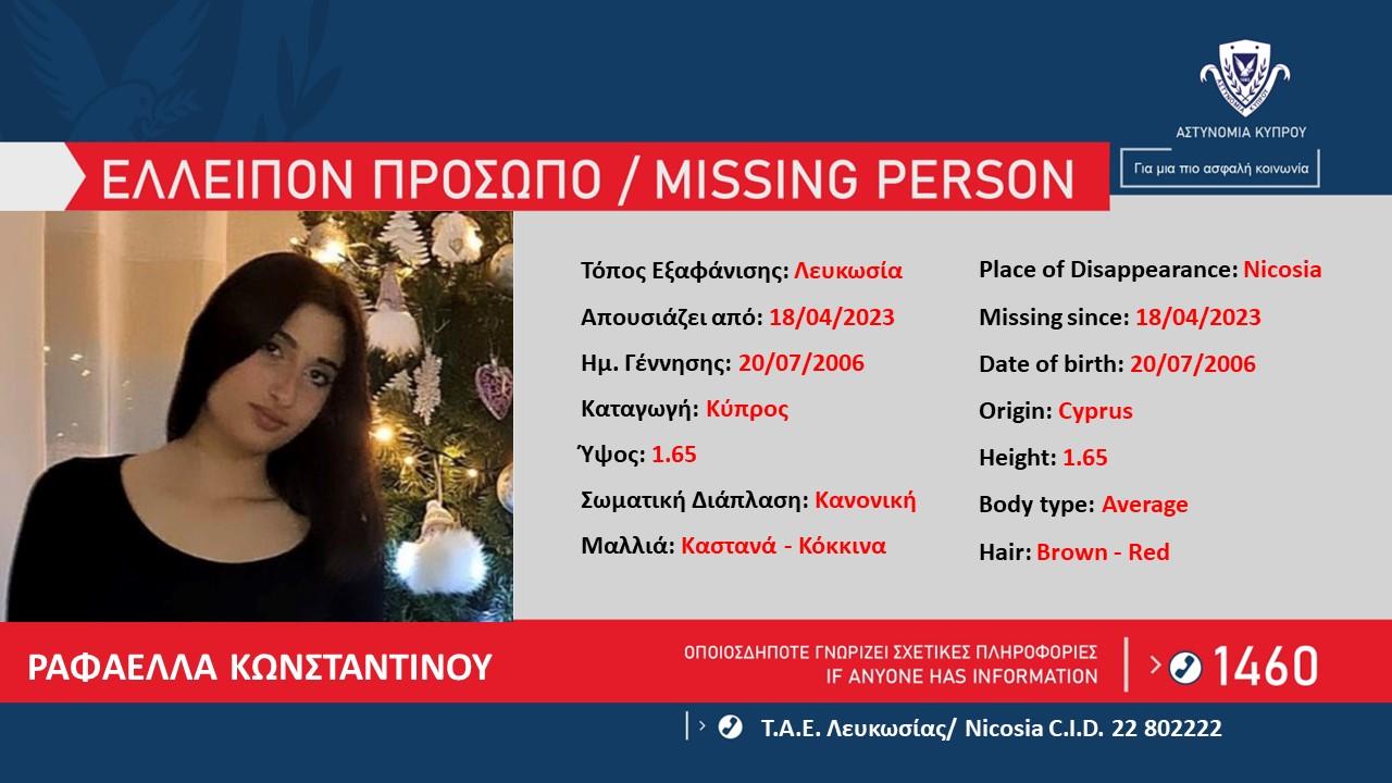 Η Αστυνομία ζητά πληροφορίες που μπορούν να βοηθήσουν στον εντοπισμό της Ραφαέλλας Κωνσταντίνου, 17 ετών, η οποία απουσιάζει από το χώρο διαμονής της, στη Λευκωσία, από το απόγευμα της 18ης Απριλίου 2023.
