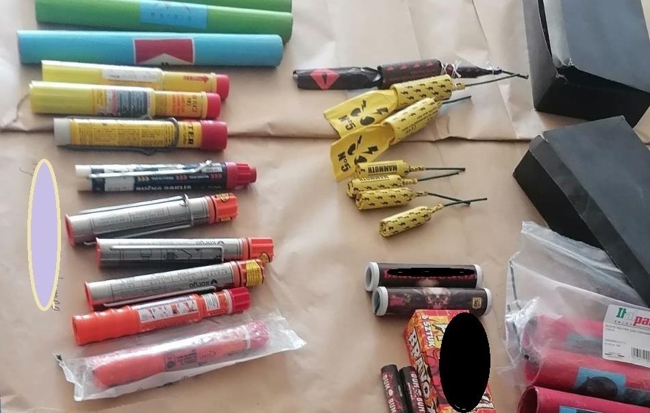 Μέλη της Αστυνομίας μετέβησαν στη σκηνή, όπου εντόπισαν τέσσερις τσάντες, οι οποίες περιείχαν πέραν των 2,000 κροτίδων, εννέα πυρσοί και 15 τεμάχια φυτιλιού.