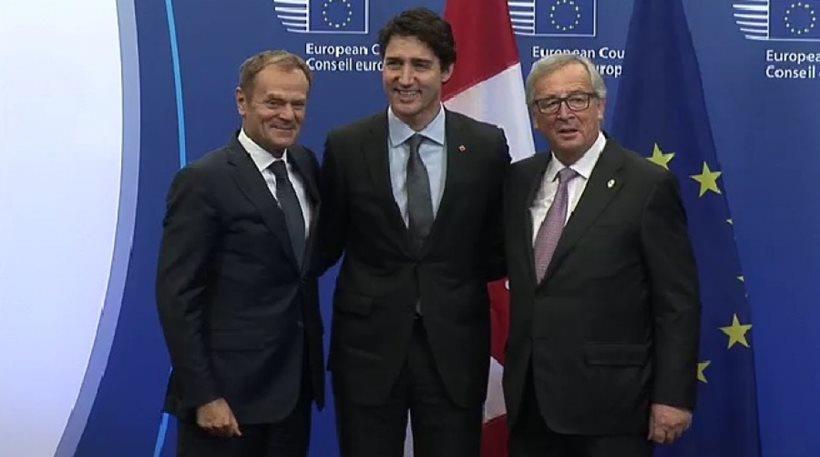 Με έναν σφικτό εναγκαλισμό και την φράση «επιτέλους» υποδέχθηκαν τον πρωθυπουργό του Καναδά Τζάστιν Τριντό ο Πρόεδρος του Ευρωπαϊκού Συμβουλίου Ντόναλντ Τουσκ και ο Πρόεδρος της Κομισιόν Ζαν Κλοντ Γιούνκερ για την υπογραφή της συμφωνίας ελεύθερου εμπορίου μεταξύ ΕΕ και Καναδά.