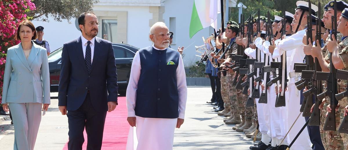 Ο Πρόεδρος της Δημοκρατίας κ. Νίκος Χριστοδουλίδης υποδέχθηκε σήμερα επίσημα, στο Προεδρικό Μέγαρο, τον Πρωθυπουργό της Ινδίας, Ναρέντρα Μόντι, ο οποίος πραγματοποιεί από την Κυριακή διήμερη επίσημη επίσκεψη στην Κύπρο.
