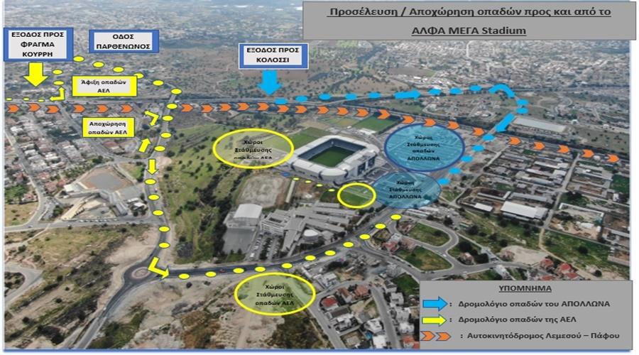 Σχετικό Σχεδιάγραμμα των δρομολογίων των οπαδών του ΑΠΟΛΛΩΝΑ και ΑΕΛ καθώς και των χώρων στάθμευσης των φίλων των δύο ομάδων επισυνάπτεται.