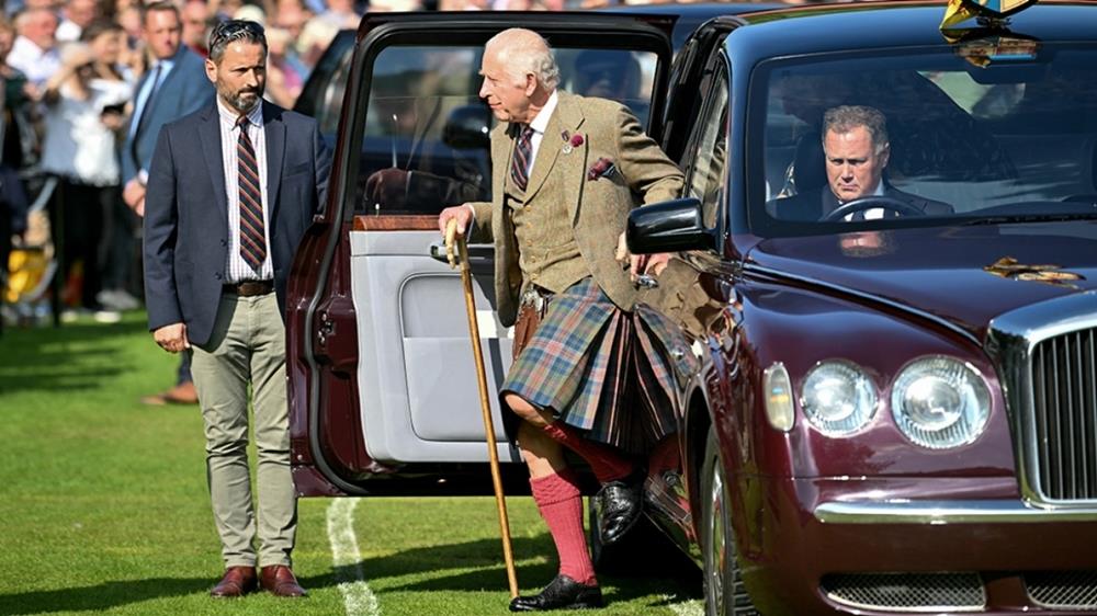 Ο Βασιλιάς Κάρολος που υποβάλλεται σε θεραπεία για τον καρκίνο, φορούσε ένα τουίντ πράσινο σακάκι και ένα πολύχρωμο κιλτ, μπλε, κόκκινου και πράσινου χρώματος και η σύζυγός του ένα φόρεμα και καπέλο με φτερά.