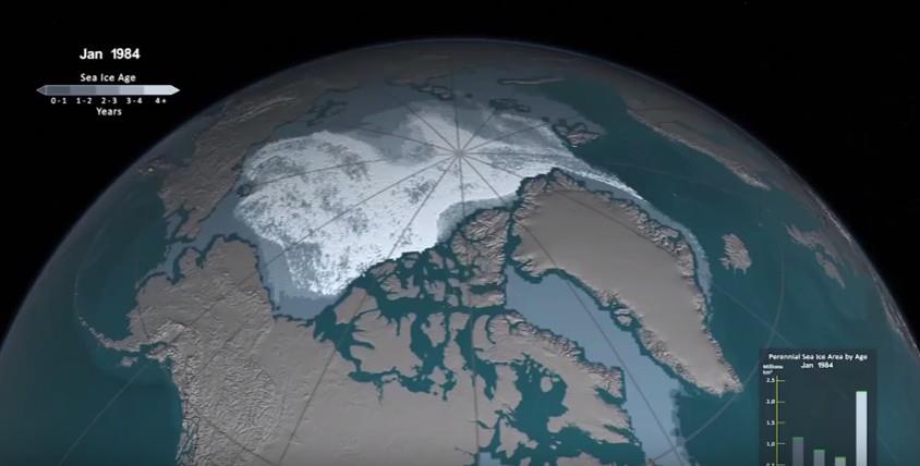 Τώρα, κινούμενη απεικόνιση της NASA αποκαλύπτει πως εξίσου γρήγορα λιώνουν και οι παλιότεροι – και, ως εκ τούτου, παχύτεροι – πάγοι της Αρκτικής. Χαρακτηριστικό της τρομακτικής συρρίκνωσής τους είναι πως τον Μάρτιο του 1984, η επιφάνειά τους εκτεινόταν σε 2.1 εκατ. τετραγωνικά χιλιόμετρα ενώ τον Μάρτιο του 2016, σε μόλις 211.000 τετραγωνικά χιλιόμετρα...
