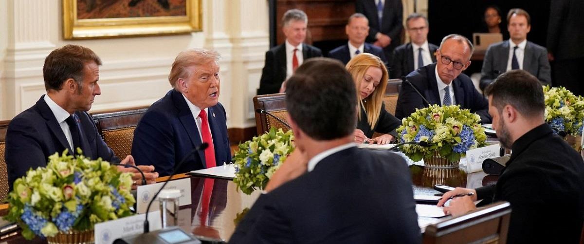 Οι επτά Ευρωπαίοι ηγέτες που στη συνάντηση με τον Ντόναλντ Τραμπ είναι η Oύρσουλα φον ντερ Λάιεν, ο Κιρ Στάρμερ, ο Εμανουέλ Μακρόν, η Τζόρτζια Μελόνι, ο Φρίντριχ Μερτς, ο Αλεξάντερ Στουμπ και ο επικεφαλής του ΝΑΤΟ Μαρκ Ρούτε.
