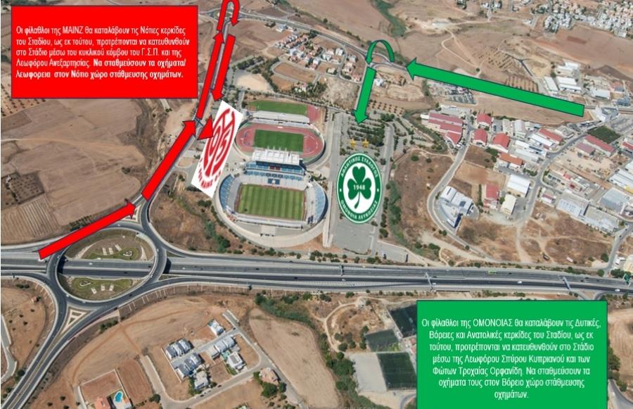 Οι φίλαθλοι της ΟΜΟΝΟΙΑΣ, θα καταλάβουν τις δυτικές, βόρειες και ανατολικές κερκίδες του σταδίου, ως εκ τούτου, προτρέπονται να κατευθυνθούν στο στάδιο μέσω της λεωφόρου Σπύρου Κυπριανού και των φώτων τροχαίας Ορφανίδη. Να σταθμεύσουν τα οχήματα τους στον δυτικό και στον βόρειο χώρο στάθμευσης οχημάτων.