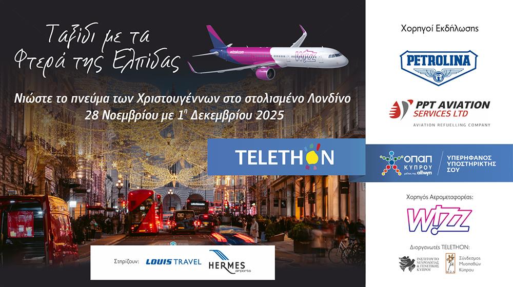 Με κύριους χορηγούς την PETROLINA και την συνδεδεμένη της εταιρεία PPT Aviation Services Ltd, και με επίσημο αερομεταφορέα τη Wizz Air, το «Ταξίδι με τα Φτερά της Ελπίδας» συνδυάζει, μια ολιγοήμερη γιορτινή εκδρομή στο στολισμένο Λονδίνο με μια πράξη αγάπης και αλληλεγγύης. Μέρος των εσόδων θα διατεθεί στο TELETHON, ενισχύοντας με αυτό τον τρόπο το έργο του Ινστιτούτου Νευρολογίας και Γενετικής Κύπρου και του Συνδέσμου Μυοπαθών Κύπρου.