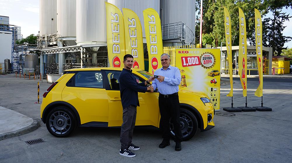 Η προωθητική ενέργεια της μπύρας ΚΕΟ 1,000 ΣΟΥΠΕΡ ΔΩΡΑ κορυφώθηκε με την παράδοση του μεγάλου δώρου στον τυχερό καταναλωτή που βρήκε στο πώμα της φιάλης του, το σήμα με το αυτοκίνητο. Ο κ. Πέτρος Κουσιάππας από την Λάρνακα είναι ο μεγάλος τυχερός που κέρδισε ένα Renault 5 E-Tech Electric το οποίο παρέλαβε από τα κεντρικά γραφεία της ΚΕΟ στη Λεμεσό. Ο Διευθύνων Σύμβουλος της ΚΕΟ κ. Χαράλαμπος Παναγιώτου συνεχάρηκε τον κ. Κουσσιάππα και του παρέδωσε τα κλειδιά του ολοκαίνουργιου αυτόματου Renault 5, με την ευχή να είναι καλοτάξιδο. Ο κ. Κουσιάππας, εμφανώς χαρούμενος, ευχαρίστησε την εταιρεία και περιέγραψε τη στιγμή της έκπληξης και της χαράς του, όταν, ανοίγοντας μια μπύρα ΚΕΟ, είδε κάτω από το καπάκι της το σήμα με το μεγάλο δώρο.