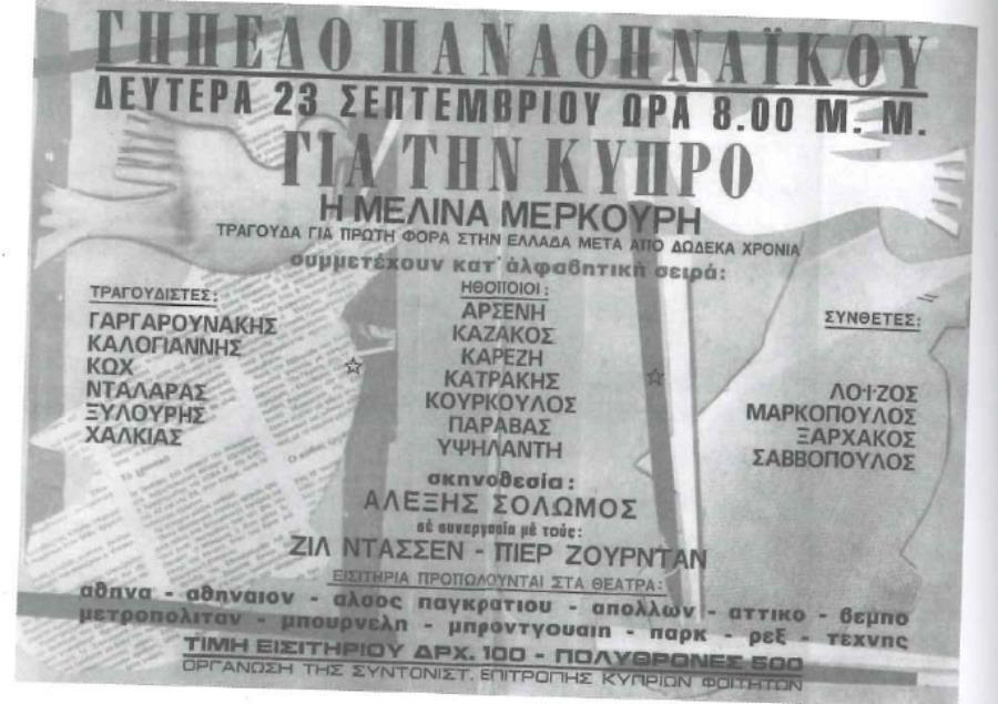 Σε αυτή την συναυλία ο Διονύσης Σαββόπουλος τραγούδησε σε πρώτη εκτέλεση το τραγούδι «Για την Κύπρο», δικής του σύνθεσης και με δικούς του στίχους.