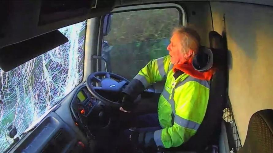 Ο 57χρονος έχει θέσει σε λειτουργία τους υαλοκαθαριστήρες του οχήματός του, όμως η κίνησή του αυτή δεν δείχνει να είναι ιδιαίτερα αποτελεσματική. Ξαφνικά, το φορτηγό πέφτει με δύναμη επάνω σε προπορευόμενο όχημα, με το παρμπρίζ του φορτηγού να σπάει και τον οδηγό να τραυματίζεται στο πρόσωπο, ενώ βγάζει μια κραυγή τρόμου.