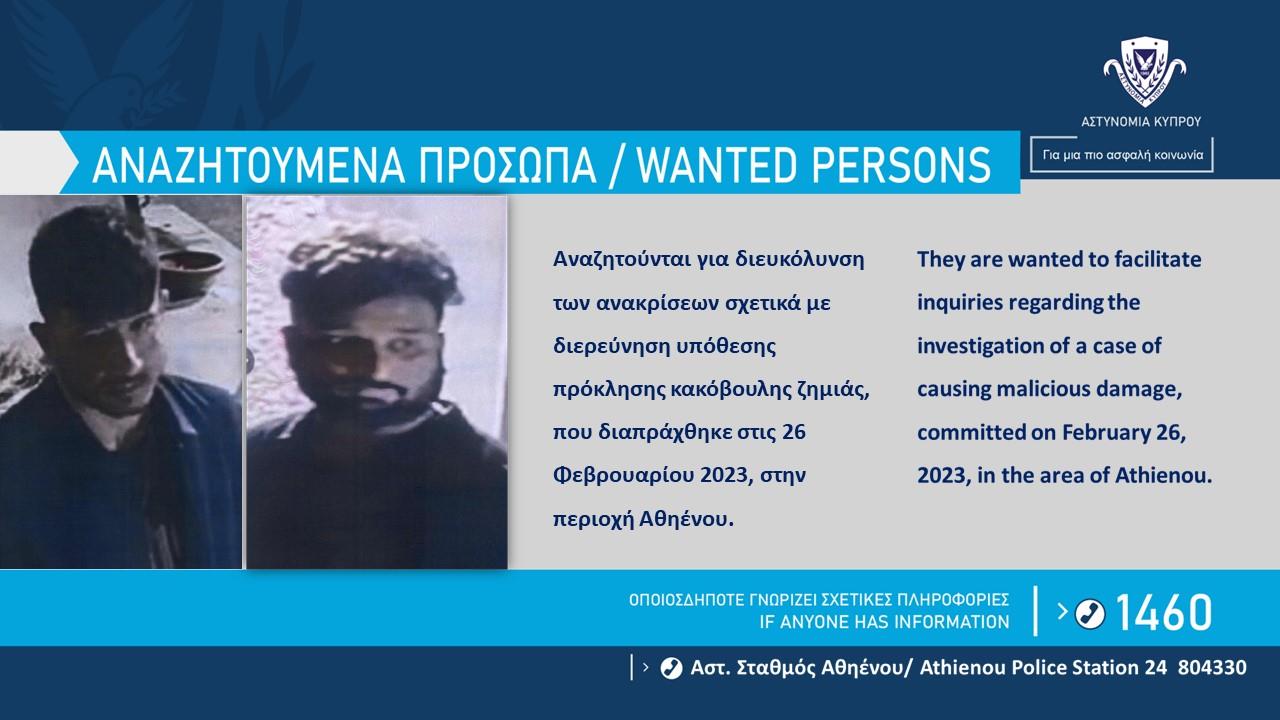 Η Αστυνομία ζητά πληροφορίες που μπορούν να βοηθήσουν στην εξακρίβωση των στοιχείων και τον εντοπισμό δύο προσώπων, που αναζητούνται για διευκόλυνση των ανακρίσεων σχετικά με διερεύνηση υπόθεσης πρόκλησης κακόβουλης ζημιάς, που διαπράχθηκε το βράδυ της 26 ης Φεβρουαρίου 2023, στην περιοχή Αθηένου.