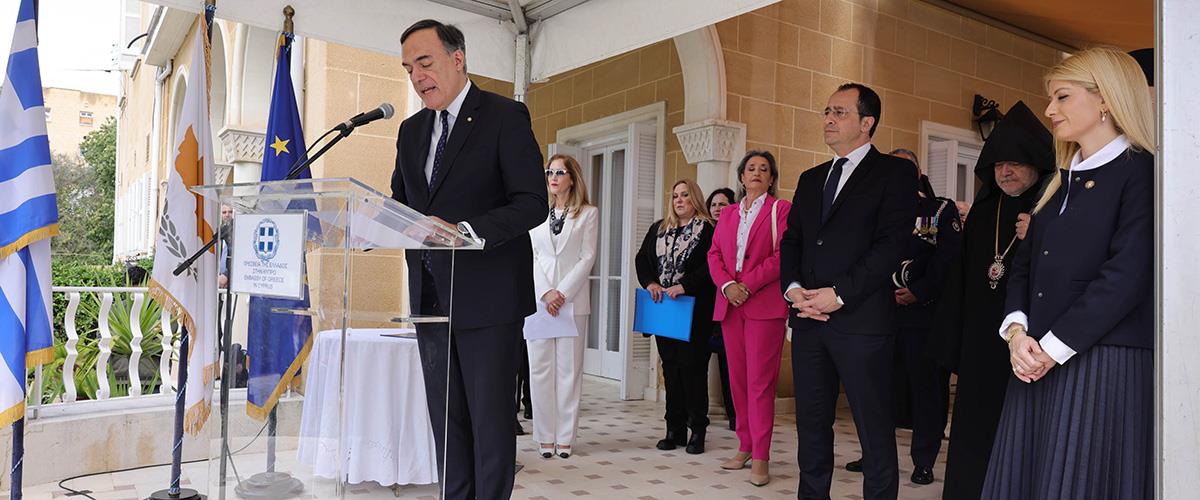 Η επίλυση του Κυπριακού αποτελεί για την Ελλάδα το κορυφαίο εθνικό ζήτημα αλλά και μία πρόκληση για το σύνολο της διεθνούς κοινότητα, τόνισε ο Πρέσβης της Ελλάδας στην Κύπρο Ιωάννης Παπαμελετίου, σε ομιλία του στην δεξίωση που παρέθεσε στην πρεσβευτική κατοικία στη Λευκωσία για την επέτειο της 25ης Μαρτίου 1821.