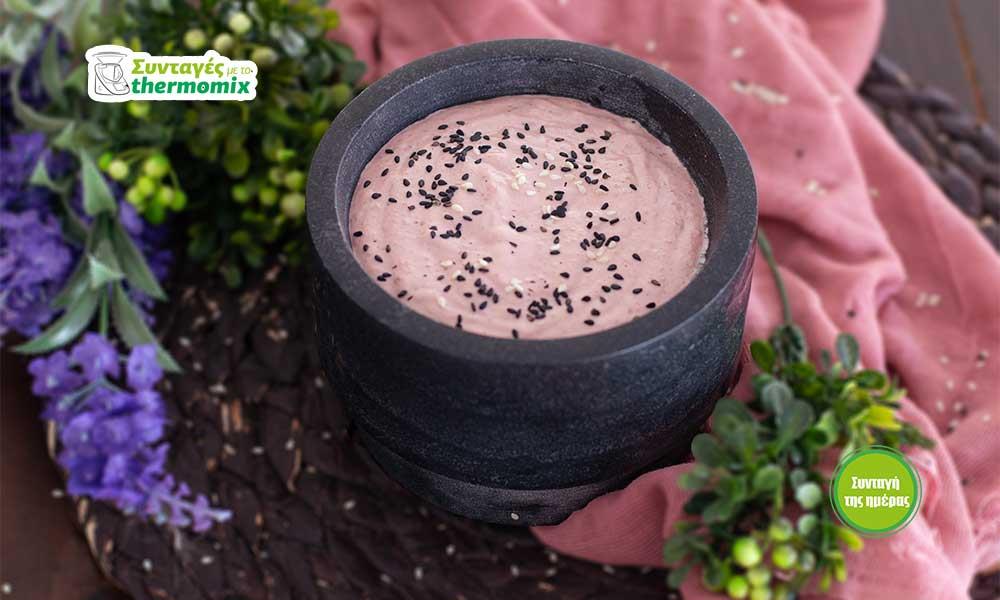 Βάλτε στον κάδο 250 γρ. ταχίνι, 120 γρ. νερό, 1.5 κουταλάκι αλάτι, 80 γρ. χυμό λεμονιού, 80 γρ. παντζάρια, βρασμένα , 1 κουταλάκι μέλι, 1 /2 κουταλάκι σκόρδο, 1 πρέζα πιπέρι, 1 /3 κ.γλ πιπέρι καγιέν και χτυπήστε 2 λεπτά/ταχύτητα 4.5. Καθαρίστε τα τοιχώματα του κάδου με τη σπάτουλα.