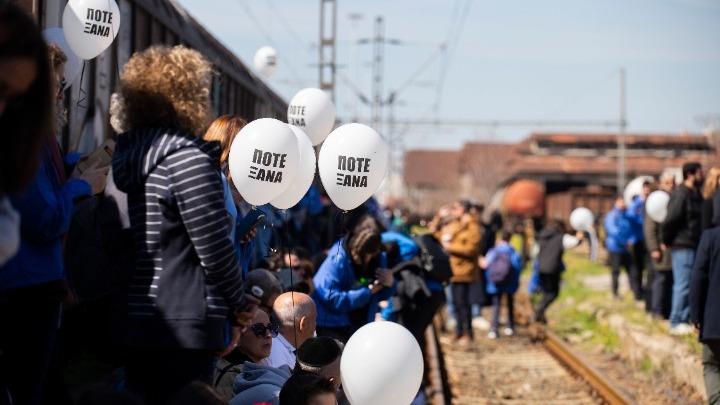 Κρατώντας λευκά μπαλόνια με το μήνυμα «Ποτέ Ξανά» και αφήνοντας κόκκινα γαρύφαλλα στις ράγες των τρένων στον παλαιό σιδηροδρομικό σταθμό της Θεσσαλονίκης, εκεί όπου πριν από 80 χρόνια ξεκίνησαν οι πρώτες αμαξοστοιχίες για τα ναζιστικά στρατόπεδα συγκέντρωσης μεταφέροντας χιλιάδες Εβραίους προς τον θάνατο, ολοκληρώθηκε η σιωπηρή πορεία μνήμης για τα θύματα του Ολοκαυτώματος, παρουσία της Προέδρου της Ελληνικής Δημοκρατίας, Κατερίνας Σακελλαροπούλου.