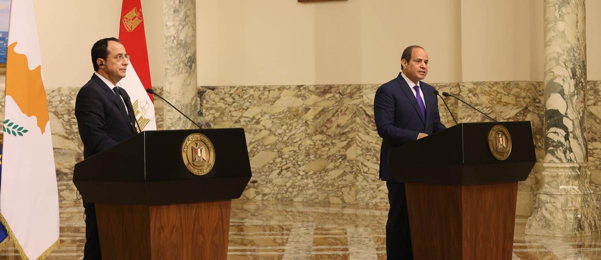 Σήμερα, ανάμεσα σε άλλα, έχουμε συμφωνήσει και στην πραγματοποίηση στην Κύπρο τον Σεπτέμβριο της επόμενης Συνόδου μεταξύ των δύο κυβερνήσεων. Η Αίγυπτος είναι η πρώτη χώρα με την οποία η Κύπρος ξεκίνησε τέτοιου είδους συνεργασία, τέτοιου είδους συναντήσεις κοινές. Προσβλέπουμε επίσης στην πραγματοποίηση της επόμενης μας συνάντησης με την Ελλάδα, ενώ ανταλλάξαμε απόψεις και για περαιτέρω διεύρυνση των σχηματισμών αυτών, πάντοτε σε Ad hoc βάση και με άλλες χώρες της περιοχής. Θεωρώ ιδιαίτερα σημαντική στην παρούσα συγκυρία, αλλά και λαμβάνοντας υπόψη τις εξελίξεις τόσο στην περιοχή μας αλλά και σε διεθνές επίπεδο, τη σύγκλιση των προσεγγίσεων ανάμεσα στην Αίγυπτο και την Κύπρο ως προς την αντιμετώπιση όλων αυτών των περιφερειακών και των διεθνών ζητημάτων, η οποία θα πρέπει να βασίζεται πάντοτε στον σεβασμό του διεθνούς δικαίου και των αρχών και αξιών του Καταστατικού Χάρτη των Ηνωμένων Εθνών. Αυτή η στάση, η κοινή στάση αρχών που τηρούμε, η προσήλωσή μας σε αρχές, όπως η ειρηνική επίλυση των διαφορών και οι σχέσεις καλής γειτονίας και η συμμόρφωση και των δύο χωρών προς τους κανόνες εθιμικού δικαίου, όπως για παράδειγμα, η Σύμβαση για το Δίκαιο της Θάλασσας του 1982, διασφαλίζουν και αποδεικνύουν ότι η συνεργασία μας, η κοινή μας προσέγγιση, δεν είναι ούτε εφήμερη ούτε ευκαιριακή.