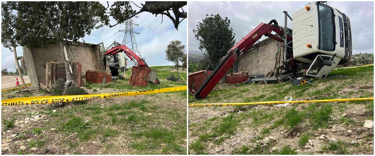 Σύμφωνα με την Αστυνομία, ενώ 51χρονος ασχολείτο με την εκφόρτωση τσιμεντένιων αντίβαρων βάρους 2-3 τόνους το καθένα, με τη χρήση γερανού που βρισκόταν εγκατεστημένος σε φορτηγό, κάτω από συνθήκες που διερευνώνται, το φορτηγό ανατράπηκε προς τα δεξιά με αποτέλεσμα ο άτυχος 55χρονος ο οποίος βρισκόταν πάνω στο φορτηγό, να πέσει στο έδαφος και να τραυματιστεί από τσιμεντένιο αντίβαρο.