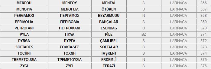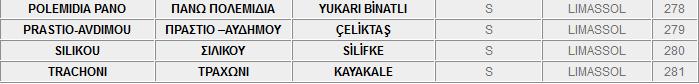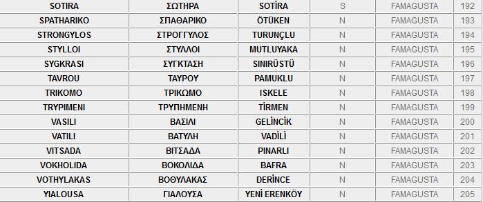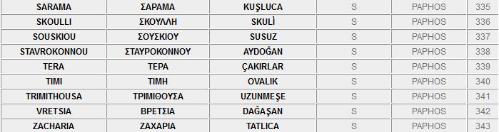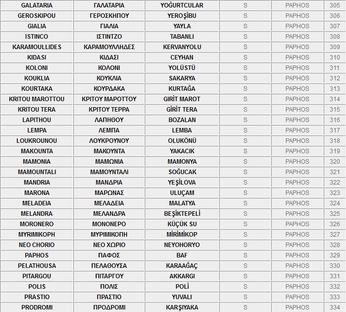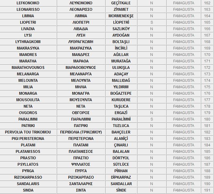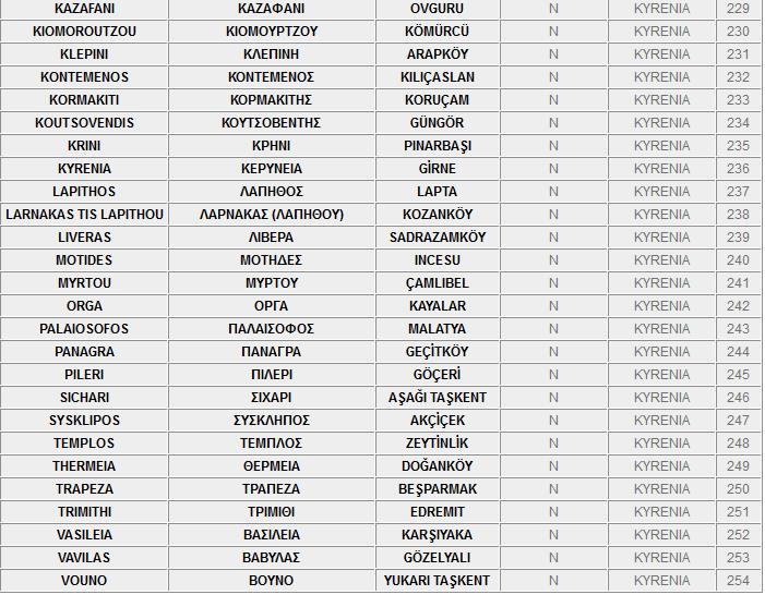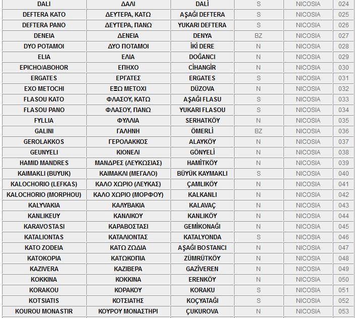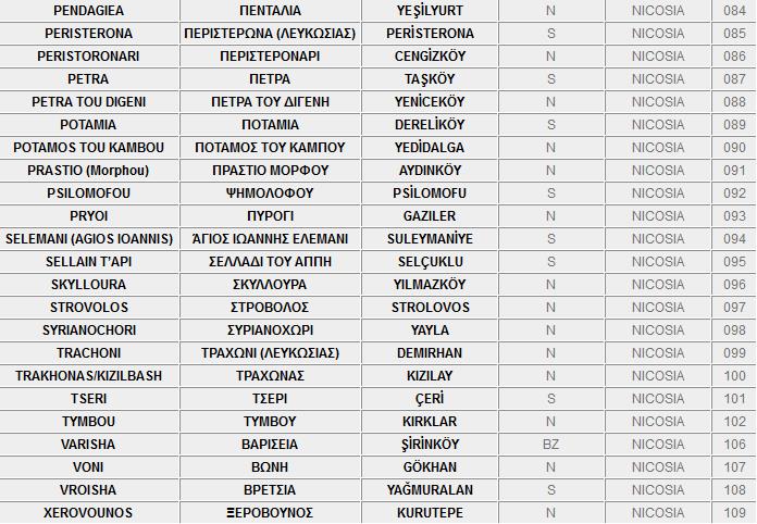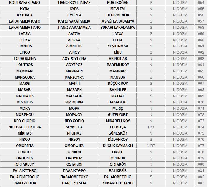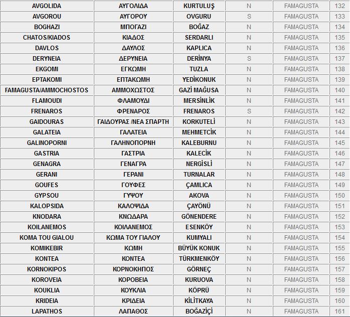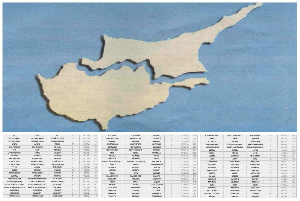 Ο πιο κάτω κατάλογος, περιλαμβάνει τα ονόματα των κατεχόμενων και ελεύθερων πόλεων και χωριών της Kύπρου στα Ελληνικά, τα Αγγλικά και τα Τούρκικα.