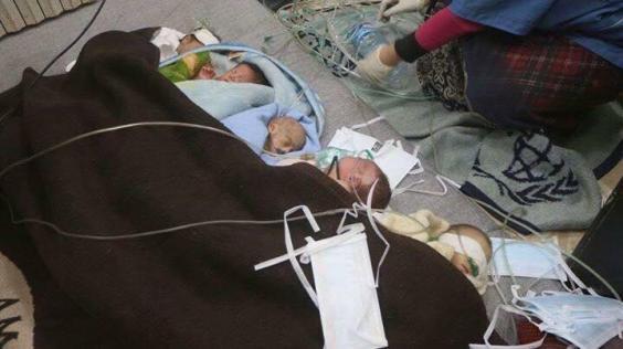 Η φωτογραφία που δημοσιεύει ο Independent από Σύρο δημοσιογράφο δείχνει τα πρόωρα μωρά να βρίσκονται στο πάτωμα καλυμμένα με μία κουβέρτα ενώ μία νοσοκόμα προσπαθεί να τα κρατήσει στη ζωή.