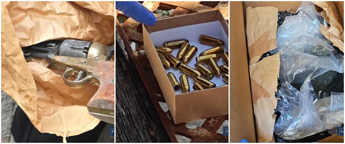 Οι Αρχές, εντόπισαν επίσης, τρία πιστόλια, εκ των οποίων τα δύο είναι αληθινά και το τρίτο ομοίωμα, αλλά και δύο αυτοσχέδιους εκρηκτικούς μηχανισμούς. Από τις εξετάσεις, εντόπισαν ακόμα τριάντα σφαίρες, καθώς και 11.640 κροτίδες, που βρίσκονταν στον ίδιο χώρο. Επίσης εντοπίστηκε χρηματικό ποσό ύψους €12765.