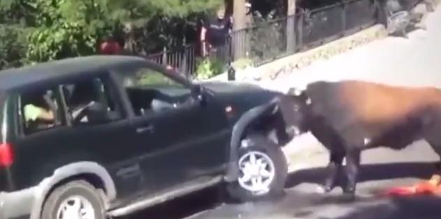 Ένας ταύρος που επιτίθεται επανειλημμένα  σε ένα αμάξι γεμάτο ανθρώπους τραβήχτηκε σε βίντεο από έναν άγνωστο περαστικό και στη συνέχεια ανέβηκε στο διαδίκτυο.