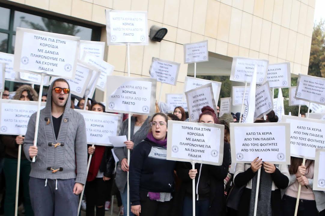 Οι φοιτητές συγκεντρώθηκαν έξω από το Υπουργείο Οικονομικών και κρατώντας πλακάτ τα οποία έγραφαν μεταξύ άλλων «Κάτω τα χέρια από τη χορηγία – Κάτω τα χέρια από το πακέτο» και «Τέρμα πια στις περικοπές, δεν φταίνε για την κρίση οι φοιτητές», φώναξαν συνθήματα όπως «Τέρμα πια στην κοροϊδία, με δάνεια πληρώνουμε για να `χουμε παιδεία» και «Δώστε λεφτά για την παιδεία, κάτω τα χέρια από τη χορηγία» διαμαρτυρήθηκαν κατά των περικοπών στο κονδύλι της φοιτητικής χορηγίας για το 2017, οι οποίες ανέρχονται στα €7,9 εκατομμύρια.