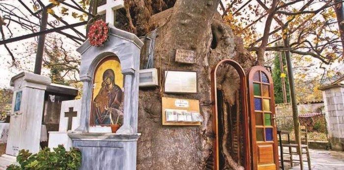 Το εκκλησάκι βρίσκεται μέσα στην κουφάλα ενός τεράστιου πλατάνου, ο οποίος προήλθε από τρία πλατάνια που φύτρωσαν μαζί, και με την πάροδο του χρόνου ενώθηκαν.