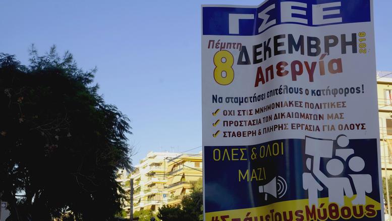 Γενική 24ωρη απεργία διοργανώνει η ΓΣΕΕ για την Πέμπτη 8 Δεκεμβρίου και συγκέντρωση στο Πεδίον του Άρεως στις 11.00 το πρωί.