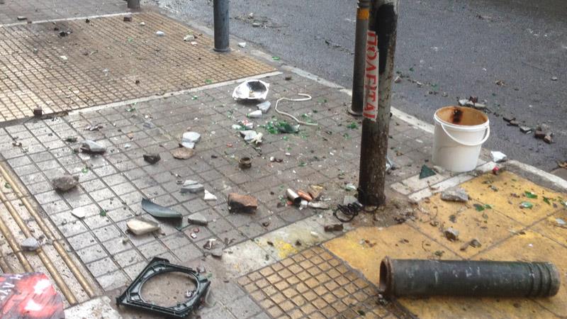 Αρκετά είναι τα καταστήματα και τα κτήρια που επλήγησαν από τη μανία των καταστροφέων με τα σπασμένα σκαλοπάτια και τις σπασμένες τζαμαρίες να «μαρτυρούν» τα χθεσινά επεισόδια ενώ πιο δίπλα, στην οδό Σολωμού, είναι ακόμη έντονη η μυρωδιά καμένου.
