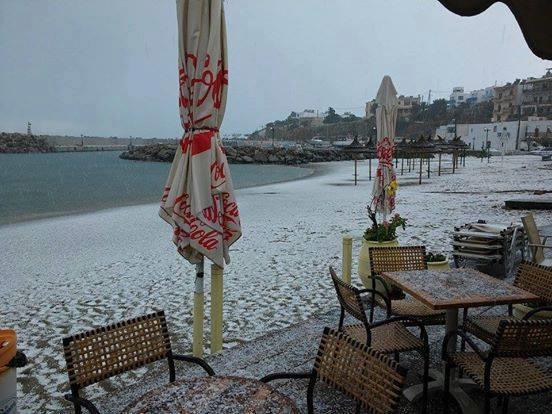 Για πρώτη φορά, στα τελευταία 25 χρόνια, η παραλία του Μακρύ Γιαλού άσπρισε από το χιόνι, που σκέπασε την άμμο και έφτασε μέχρι τη θάλασσα.