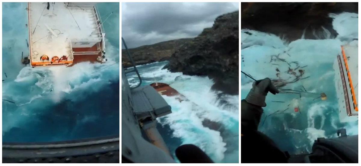 Στις δραματικές εικόνες, που αποδεικνύουν ότι οι εννέα άντρες σώθηκαν κυριολεκτικά την τελευταία στιγμή, πριν η μανιασμένη θάλασσα «καταπιεί» ολόκληρο το καράβι, φαίνεται η προσπάθεια των αντρών του Πολεμικού Ναυτικού να τους διασώσουν. Οι εικόνες δείχνουν τα φουρτουνιασμένα κύματα να έχουν σκεπάσει σχεδόν ολόκληρο το πλοίο. Μόνο η γέφυρα παραμένει πάνω από την επιφάνεια, ενώ στο κατάστρωμα έχουν ανέβει οι ναυτικοί φορώντας τα πορτοκαλί σωσίβια και περιμένουν να σωθούν.