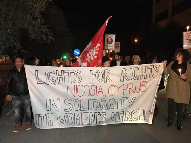 Οι συμμετέχοντες στην εκδήλωση, τοποθέτησαν κεριά έξω από την Πρεσβεία και κρατούσαν πανό με συνθήματα κατά του Αμερικανού Προέδρου Ντόναλτ Τζον Τραμπ με το κύριο πανό να γράφει: «Ένα κερί για τα ανθρώπινα δικαιώματα – Λευκωσία, Κύπρος - Αλληλεγγύη στις πορείες γυναικών».
