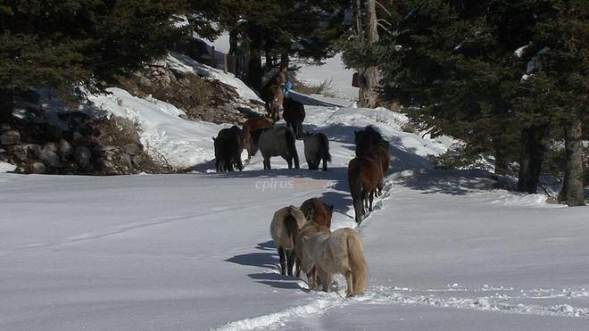 Σε κάποια από τις πλαγιές του βουνού, είναι εγκλωβισμένα εδώ και δεκαπέντε ημέρες, είκοσι άλογα, που ανήκουν στην φυλή της Πίνδου.