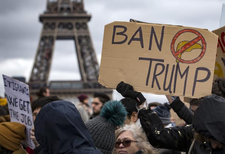 Τουλάχιστον 1.000 άνθρωποι, μεταξύ αυτών πολλοί υπήκοοι ξένων χωρών που διαμένουν στο Παρίσι, διαδήλωσαν σήμερα στο Παρίσι κατά του αντιμεταναστευτικού διατάγματος του προέδρου των ΗΠΑ, μετέδωσε επίσης δημοσιογράφος του Γαλλικού Πρακτορείου. "Βρισκόμαστε εδώ για να δηλώσουμε ότι δεν αποδεχόμαστε το μίσος" εξήγησε ο Μάικλ Τζέικομπς, ένας Αμερικανός ηλικίας 20 ετών, εκ των συνδιοργανωτών της κινητοποίησης, στην οποία συμμετείχαν πολλοί συμπατριώτες του όπως επίσης Γάλλοι και ξένοι από διάφορες χώρες. "Ο Τραμπ πρέπει να φύγει!", "οι πρόσφυγες είναι οι καλοδεχόμενοι!", "λαός ενωμένος, ποτέ διχασμένος!" ήταν μερικά από τα συνθήματα που φώναζαν οι διαδηλωτές. Ομοσπονδιακός δικαστής του Σιάτλ μπλόκαρε προσωρινά χθες το αντιμεταναστευτικό διάταγμα του Αμερικανού προέδρου που έχει στόχο επτά χώρες με κυρίως μουσουλμανικό πληθυσμό, προκαλώντας την οργή του Ντόναλντ Τραμπ.
