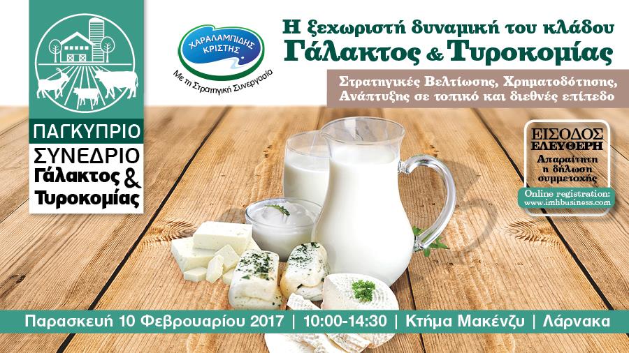 Στο «Παγκύπριο Συνέδριο Γάλακτος & Τυροκομίας» που διοργανώνεται από την ΙΜΗ την Παρασκευή 10 Φεβρουαρίου 2017 στο Κτήμα Μακένζυ, στη Λάρνακα, με τη στρατηγική συνεργασία της Χαραλαμπίδης Κρίστης, οι σύνεδροι θα ενημερωθούν περαιτέρω για τις εξελίξεις στον του τομέα Γάλακτος και της Τυροκομίας στην Κύπρο. Αρχικά, ο υπουργός Γεωργίας, Αγροτικής Ανάπτυξης και Περιβάλλοντος, κ. Νίκος Κουγιάλης -του οποίου το συνέδριο τελεί υπό την αιγίδα- θα παρουσιάσει τη στρατηγική και πολιτική του Υπουργείου σε θέματα Γάλακτος και Τυροκομίας, και θα αναφερθεί στους τρόπους αύξησης της παραγωγής αιγοπρόβειου γάλακτος στην Κύπρο. Την  πραγματικότητα που ισχύει σε εθνικό και διεθνές επίπεδο στον Γαλακτοκομικό Τομέα, θα αναλύσει ο Επ. Καθηγητής Φώτης Παπαδήμας του Εργαστηρίου Επιστήμης και Τεχνολογίας Γάλακτος, του Τμήματος Γεωπονικών Επιστημών, Βιοτεχνολογίας και Επιστήμης Τροφίμων του Τεχνολογικού Πανεπιστημίου Κύπρου & Μέλος της Εθνικής Επιτροπής Γάλακτος. Ακολούθως, θα δοθεί ο λόγος σε εκπροσώπους των εμπλεκόμενων Συνδέσμων [όπως είναι ο Σύνδεσμος Τυροκόμων Κύπρου, ο Παγκύπριος Οργανισμός Αγελαδοτρόφων (ΠΟΑ) Δημόσια Λτδ και η Παγκύπρια Εταιρεία Αιγοπροβατοτρόφων (ΠΕΑΠ)] για να καταθέσουν τις δικές τους απόψεις. Απώτερος σκοπός του Συνεδρίου, είναι η ανάδειξη της σημαντικότητας των κλάδων Γάλακτος και Τυροκομίας, ο εντοπισμός δυσκολιών κι εμποδίων, καθώς και η επίλυση των προβλημάτων που αντιμετωπίζουν οι επαγγελματίες του κλάδου.