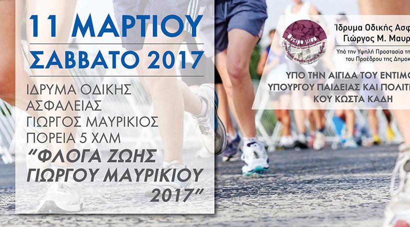Με το Σύνθημα «Φλόγα Ζωής Γιώργου Μαυρίκιου 2017» θα πραγματοποιηθεί μεθαύριο Σάββατο 11/3/2017 πορεία 5 χιλιομέτρων στη Λευκωσία, η οποία διοργανώνεται από το Ίδρυμα Οδικής Ασφάλειας Γιώργος Μαυρίκιος με τη στήριξη της Τροχαίας Λευκωσίας και των Εθελοντών Οδικής Ασφάλειας Τροχαίας Λεμεσού.