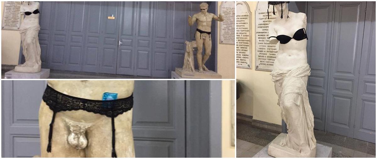 Αντιδράσεις προκάλεσε η πρωτοβουλία του Παγκυπρίου Γυμνασίου να «ντύσει» δύο αρχαία αγάλματα του σχολείου με ζαρτιέρες, σουτιέν και προφυλακτικά.