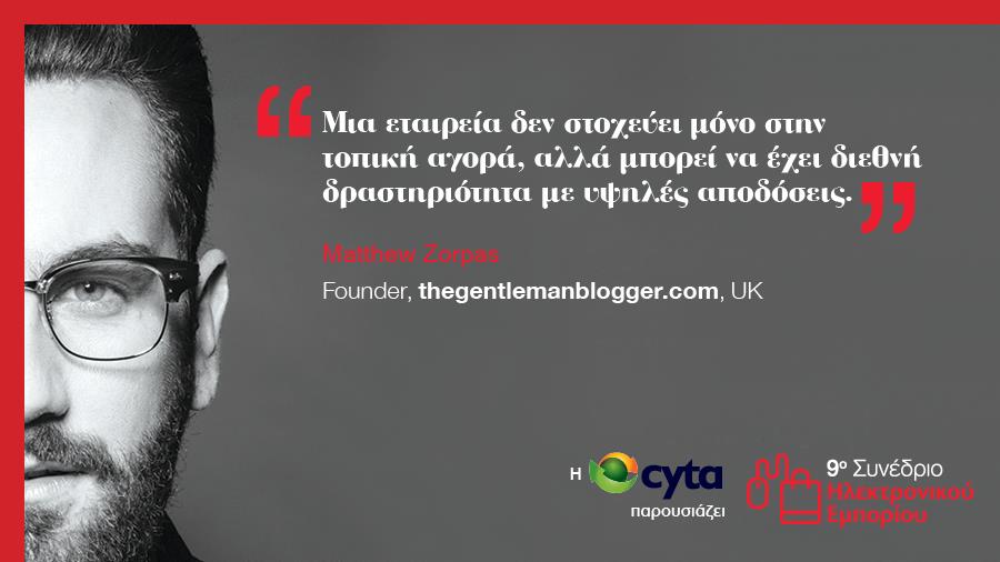Τι συμβαίνει, όμως, όταν το Ηλεκτρονικό Εμπόριο διασταυρώνεται με το Blogging; Πώς αλληλεπιδρούν τα συγκεκριμένα πολύ δυναμικά στοιχεία και ποιο το αποτέλεσμα; Ο Matthew Ζορπάς, ιδρυτής του thegentlemanblogger.com, μιλά στο Συνέδριο και παρουσιάζει τη θεματική “A Perspective on the Current and Future of Digital Targeting. Blogging: Wave of a better Future?”.