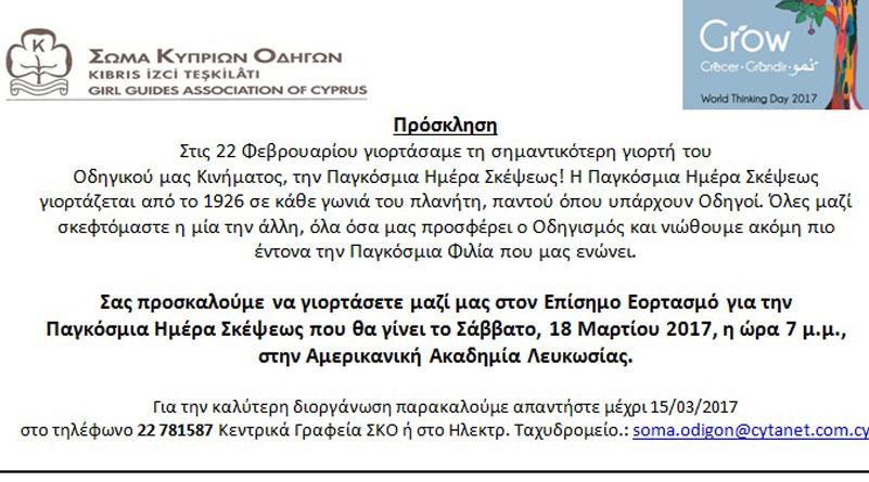Το Σώμα Κυπρίων Οδηγών διοργανώνει το Σάββατο 18 Μαρτίου τον ετήσιο Εορτασμό της Παγκόσμιας Ημέρας Σκέψεως που γιορτάζεται κάθε χρόνο στις 22 Φεβρουαρίου.  Ο εορτασμός θα αρχίσει στις 19.00 στην Αμερικάνικη Ακαδημία στη Λευκωσία.