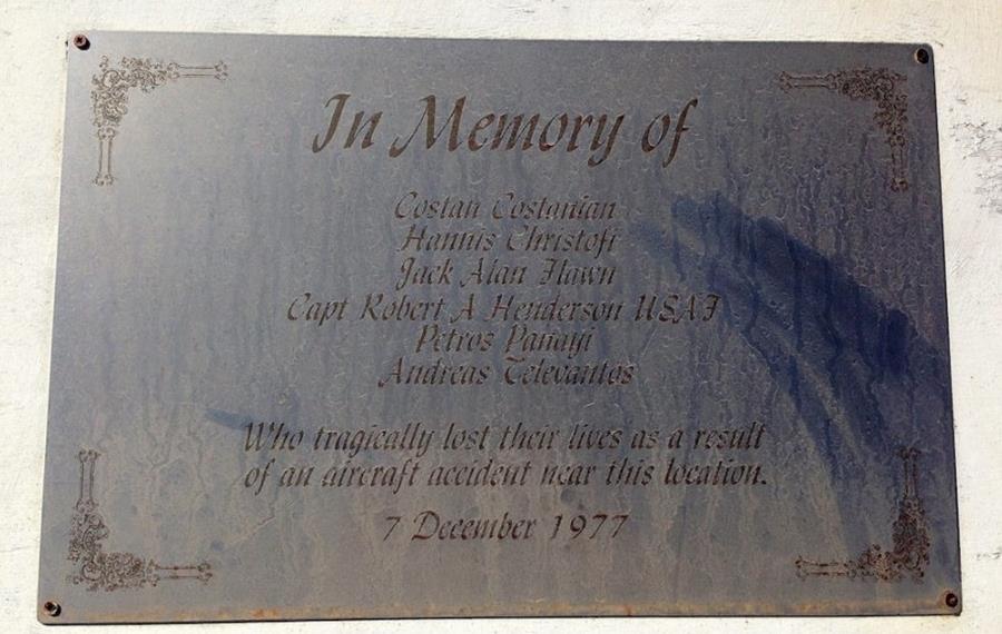 Κοντά στο σημείο που σημειώθηκε το ατύχημα έχει φτιαχτεί μνημείο προς τιμήν των θυμάτων της αεροπορικής τραγωδίας με τα ονόματά τους. Στο δυστύχημα έχασαν τη ζωή τους ο Κώστας Κωστανιάν, ο Χάνης Χριστοφή, ο Πέτρος Παναγή, ο Αντρέας Τελεβάντος, ο Αμερικανός πιλότος Robert Henderson και ο Jack Alan.