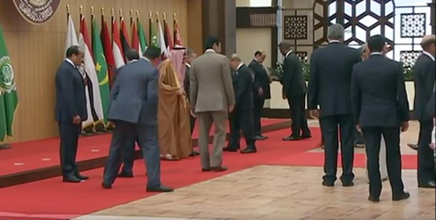 Αποτέλεσμα ήταν να σκοντάψει και να πέσει με το πρόσωπο στο έδαφος χωρίς ευτυχώς να χτυπήσει. Δύο άνδρες σπεύδουν προς βοήθεια του και αφού διαπιστώνεται ότι δεν έχει τραυματιστεί, ο Αούν σηκώνεται και παίρνει θέση δίπλα στους άλλους Άραβες ηγέτες.