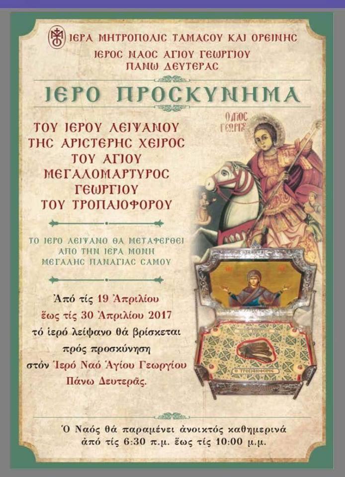 Στην Κύπρο για προσκύνημα μεταφέρθηκε το ιερό λείψανο του αριστερού χεριού του Αγίου Γεωργίου από την ιερά μονή Μεγάλης Παναγιάς Σάμου.