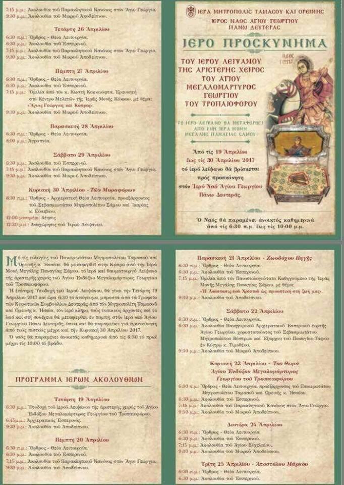 Το ιερό λείψανο μεταφέρθηκε ψες γύρω στις 6:30 το απόγευμα στην εκκλησία του Αγίου Γεωργίου στην πάνω Δευτερά και θα παραμείνει για προσκύνημα μέχρι τις 30 Απριλίου.