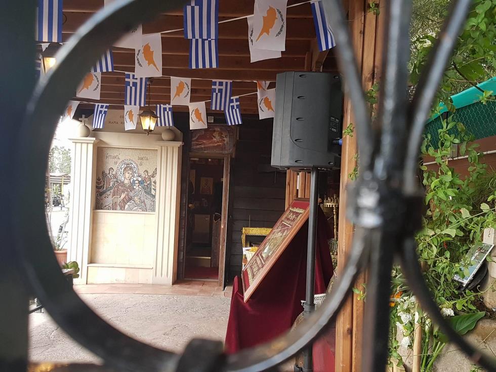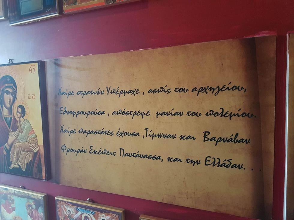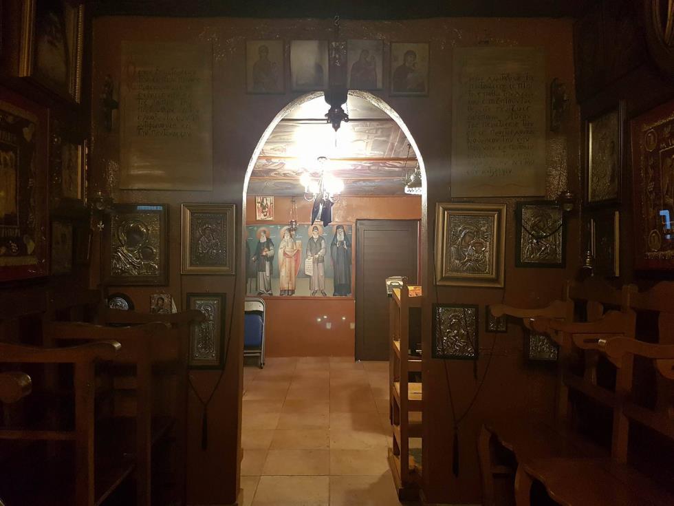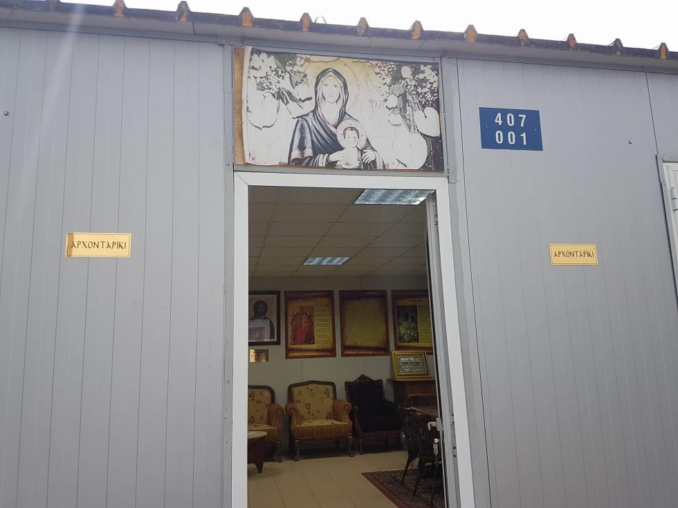 Αποφασίζω να επισκεφτώ το εκκλησάκι ανήμερα της Μεγάλης Παρασκευής. Το όμορφο κτίσμα δεν θύμιζε καθόλου αποθήκη. Ένα πραγματικό στολίδι στην είσοδο του Τάγματος που βρίσκεται εκεί 17 χρόνια. Από το 2009 Αξιωματικοί και στρατιώτες με όρεξη και πολύ αφοσίωση έκτισαν ένα εκκλησάκι βασισμένο στη μοναδική θεματολογία της Ιεράς Μονής Βατοπαιδίου στο Άγιο Όρος.