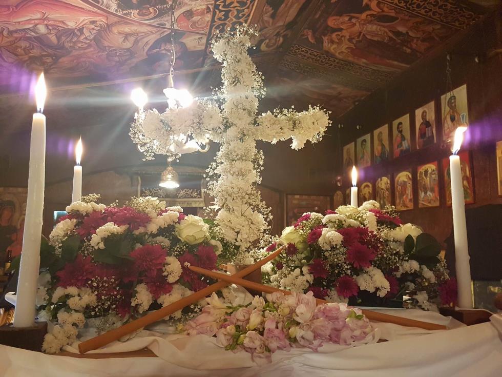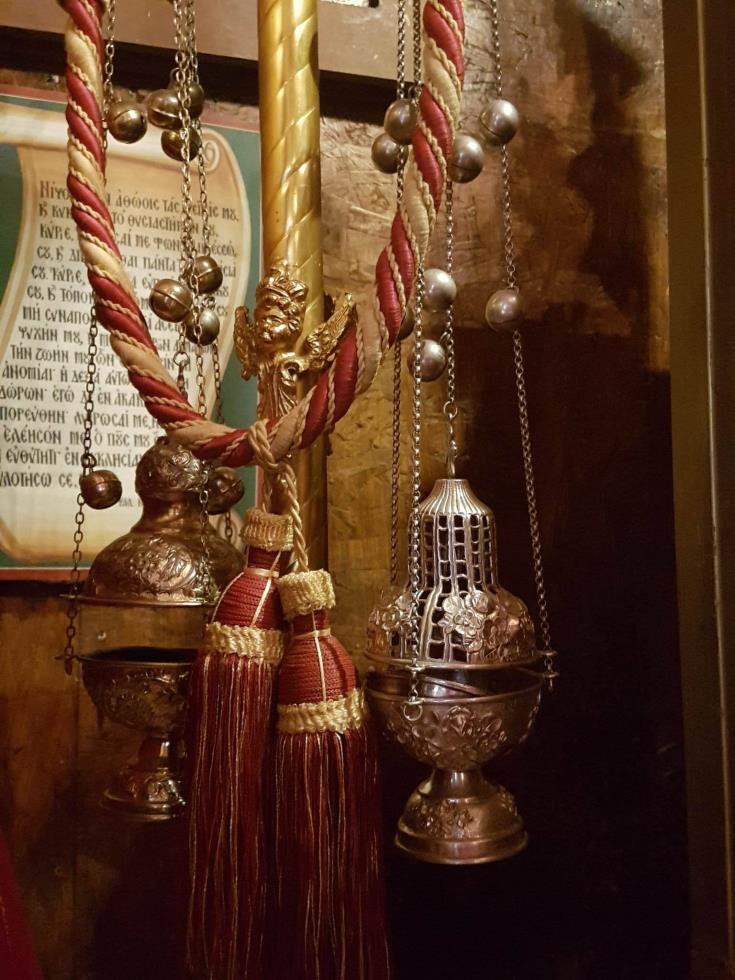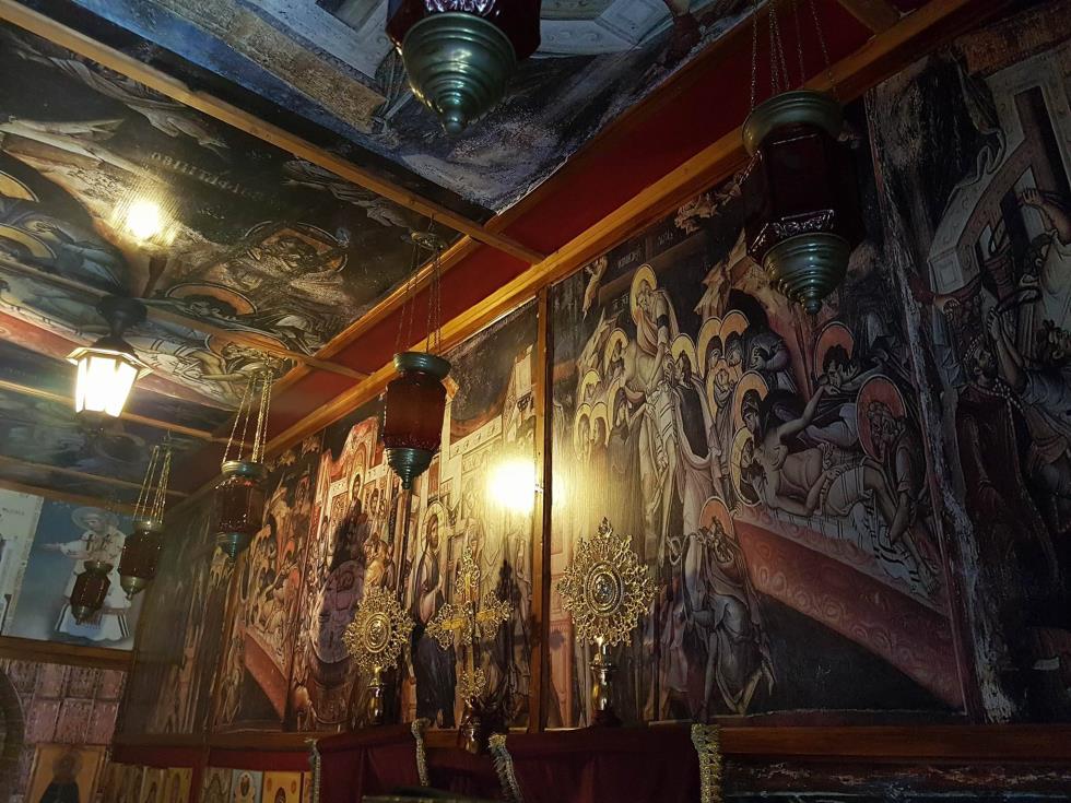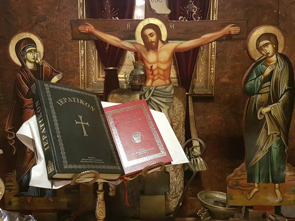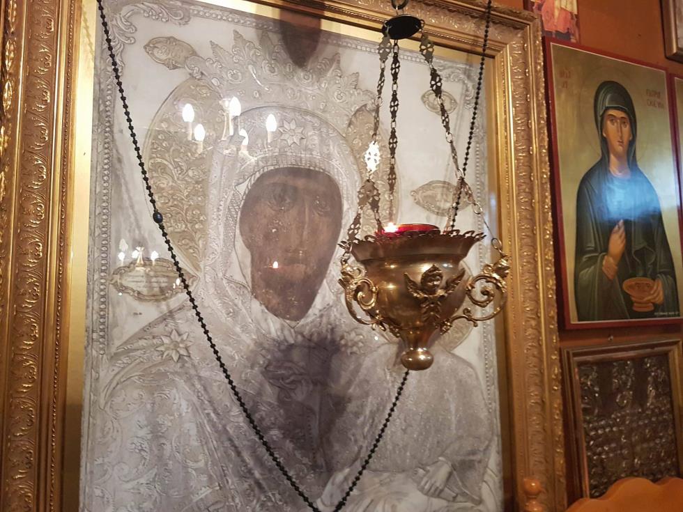Αποφασίζω να επισκεφτώ το εκκλησάκι ανήμερα της Μεγάλης Παρασκευής. Το όμορφο κτίσμα δεν θύμιζε καθόλου αποθήκη. Ένα πραγματικό στολίδι στην είσοδο του Τάγματος που βρίσκεται εκεί 17 χρόνια. Από το 2009 Αξιωματικοί και στρατιώτες με όρεξη και πολύ αφοσίωση έκτισαν ένα εκκλησάκι βασισμένο στη μοναδική θεματολογία της Ιεράς Μονής Βατοπαιδίου στο Άγιο Όρος.
