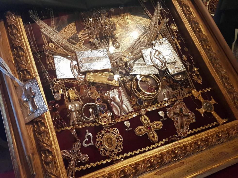 Η εκκλησία είναι γεμάτη εικόνες, πάντα σύμφωνα με τη θεματολογία και τα πρότυπα της Μονής Βατοπαιδίου. Σε μια γωνιά,  μπορεί κανείς να δει μια μεγάλη βιτρίνα με λείψανα αγίων. Όλα δωρεές από διάφορους ναούς και εκκλησίες από Ελλάδα και Κύπρο. Άξια προσκυνήματος.