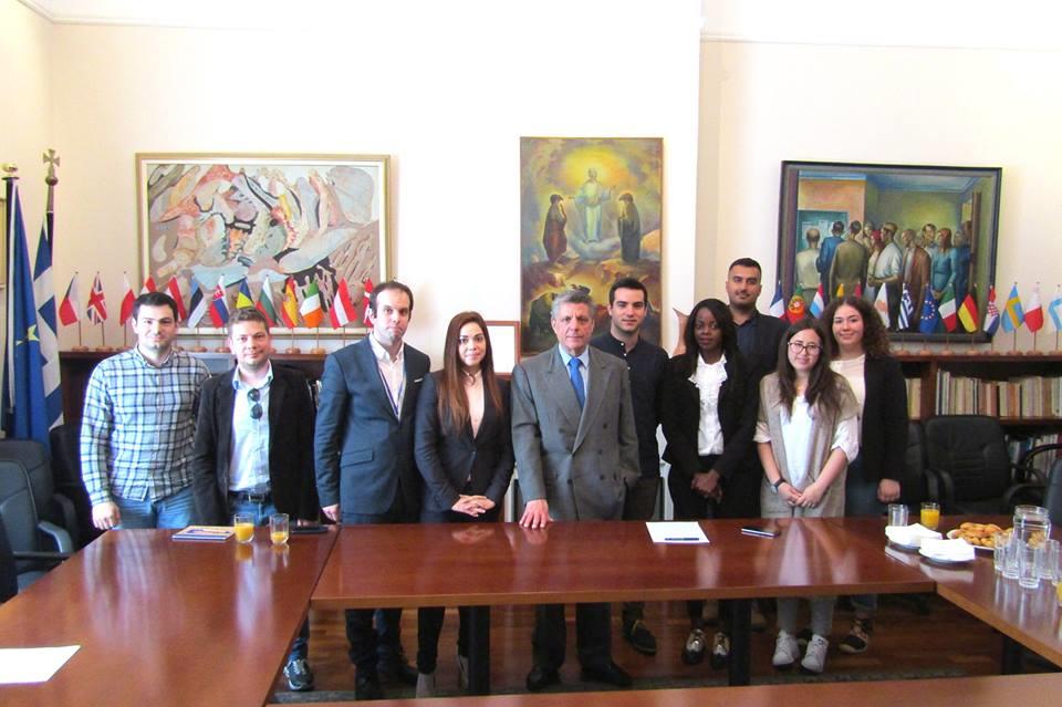 Ο Έλληνας πρέσβης στην Κύπρο κ. Ηλίας Φωτόπουλος υποδέχθηκε με θέρμη την αντιπροσωπεία του οργανισμού, αλλά και Κύπριους νέους οι οποίοι επέδειξαν ενδιαφέρον για τη συνάντηση. Με τον ‘Έλληνα Πρέσβη ακολούθησε συζήτηση και ανταλλαγή απόψεων σε τρέχοντα θέματα διεθνών σχέσεων και εξωτερικής πολιτικής με κύριο θέμα συζήτησης το μέλλον της Ευρωπαϊκής Ένωσης.