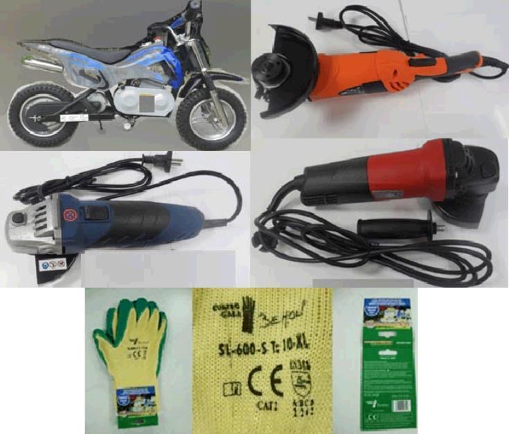 Το Τμήμα Επιθεώρησης Εργασίας του Υπουργείου Εργασίας ανακοίνωσε ότι εντοπίστηκαν στην κοινοτική αγορά λειαντήρες, παιδική ηλεκτρική μοτοσικλέτα και γάντια κήπου που εμπεριέχουν κινδύνους στους χρήστες.