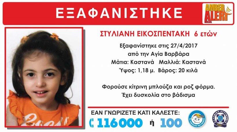 Tα ίχνη της 6χρονης Στυλιανής Εικοσπεντάκη αναζητούν η αστυνομία και το Χαμόγελο του Παιδιού που εξέδωσε Amber Alert για τον εντοπισμό της.