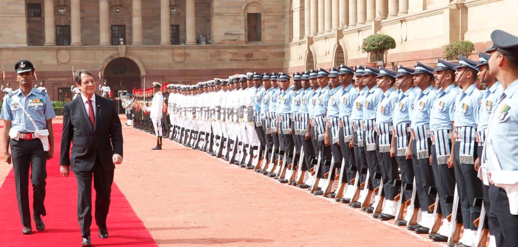 Επίσημης υποδοχής από τον Πρόεδρο της Ινδίας Pranab Mukherjee, στο Προεδρικό Μέγαρο της χώρας, στο Νέο Δελχί, έτυχε σήμερα ο Πρόεδρος της Δημοκρατίας, Νίκος Αναστασιάδης, ο οποίος σε δήλωσή του είπε πως η Κύπρος προσβλέπει σε περαιτέρω ενίσχυση της συνεργασίας Κύπρου - Ινδίας και εξέφρασε ευγνωμοσύνη για τη θέση αρχών του Νέου Δελχί σε ό,τι αφορά τις προσπάθειες για εξεύρεση ειρηνικής λύσης στο Κυπριακό.